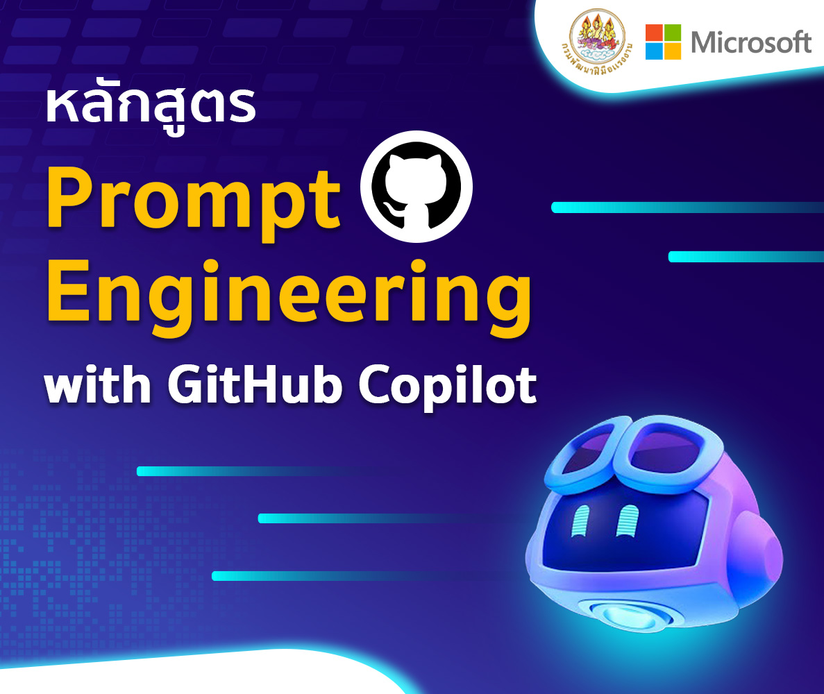 หลักสูตร GitHub Copilot สำหรับนักพัฒนา สอนหลักการพื้นฐานของ Prompt Engineering สำหรับนักพัฒนา พร้อมการใช้งาน AI ที่จะมาช่วยคาดเดาและแนะนำโค้ด เหมือนมี Pair Programmer มานั่งข้าง ๆ